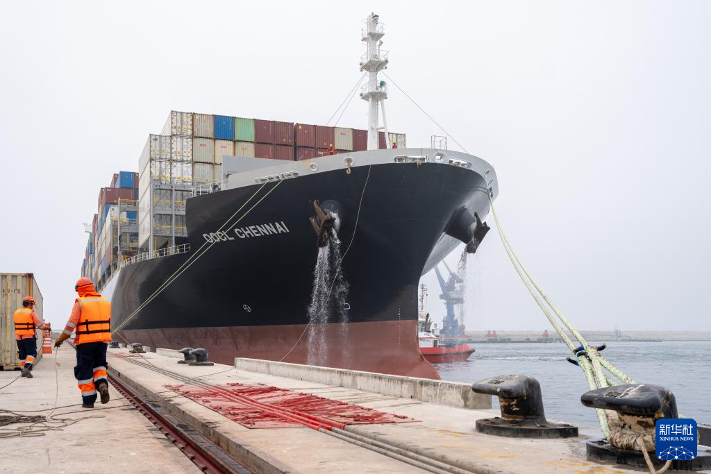 5月16日,在秘魯錢凱港,碼頭工作人員對集裝箱船“金奈”輪開展系泊作業。新華社記者 李木子 攝
