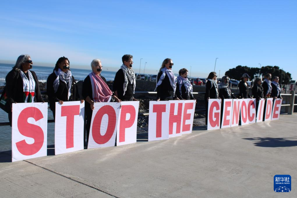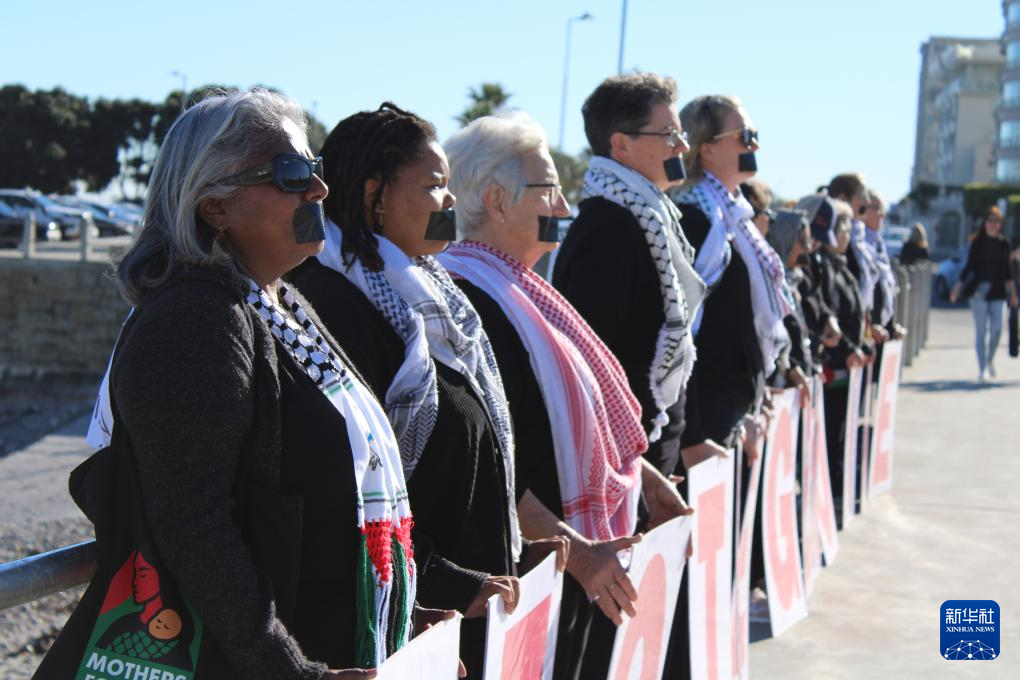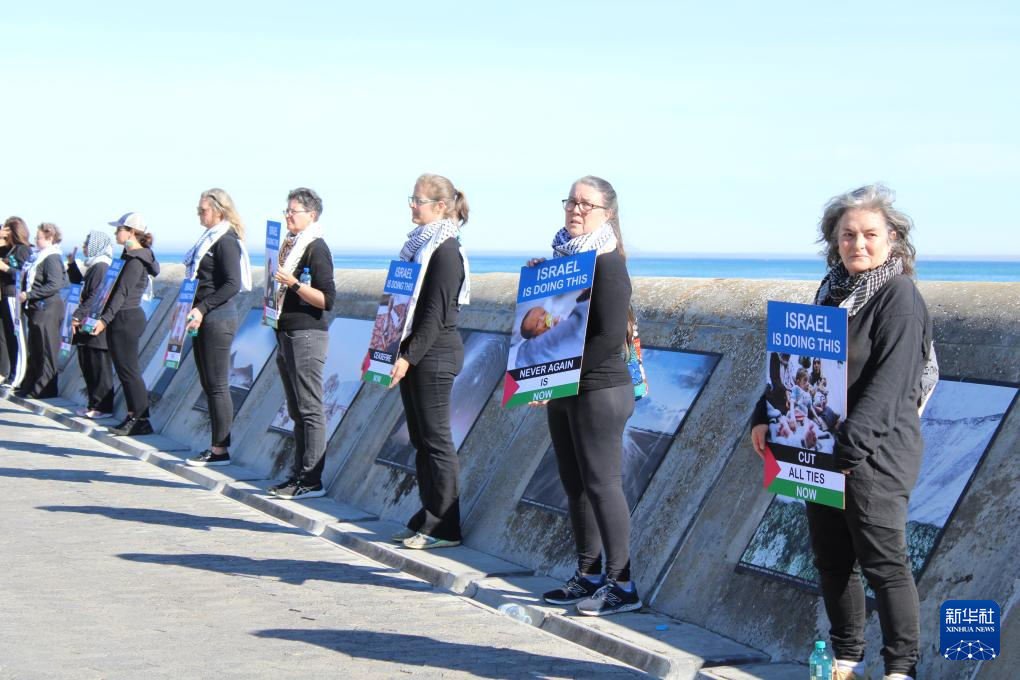 海岸邊,十多位不同膚色和年齡的南非女性沿著步行道一字排開,肅然佇立。她們身著一襲黑衣,嘴上貼著黑色膠布,每人手中舉著一塊紅色字母牌,組成了“停止種族滅絕”的字樣。
