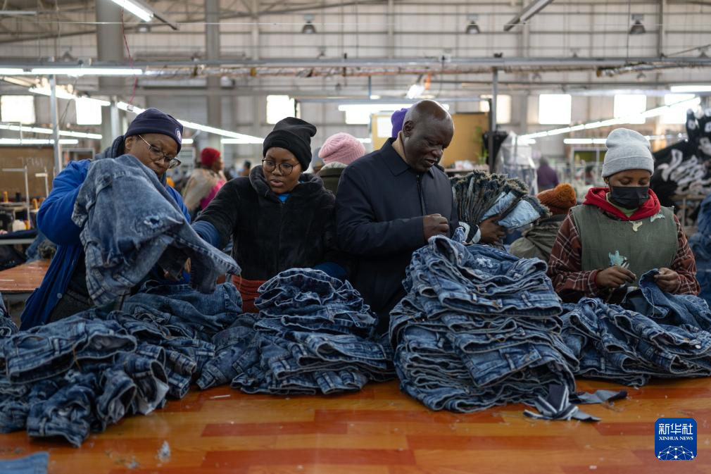 7月29日,在萊索托首都馬塞盧,非洲出口紡織品工廠負責人泰博霍·科貝利(右二)檢查產品。新華社記者 王冠森 攝
