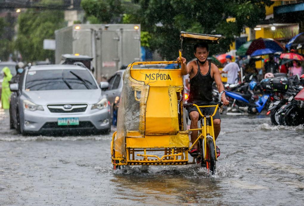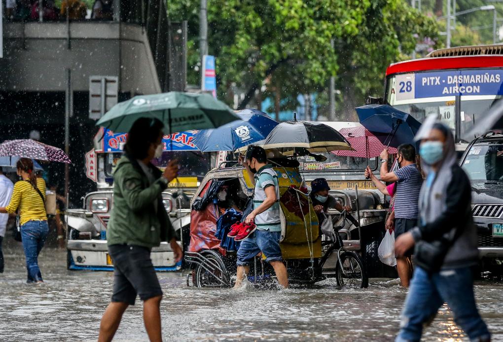 2021年7月21日,行人在菲律賓馬尼拉街頭的積水中前行。新華社發(烏馬利攝)
