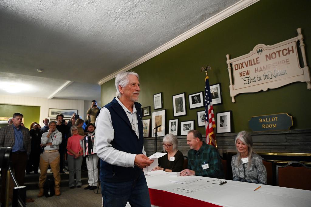 2024年11月5日,在美國新罕布什爾州迪克斯維爾山口鎮,一名選民準備填寫選票。新華社記者李睿攝