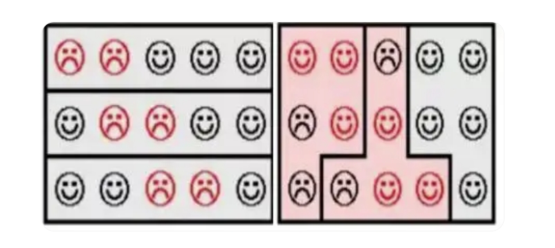 上圖是個簡化的例子,在選民整體結構不變的情況下,通過選區劃分的不同,黑方在左圖的每個選區中都獲得了多數,繼而對紅方取得3:0的優勢,但按右圖方式劃分,紅方反而取得2:1的領先。