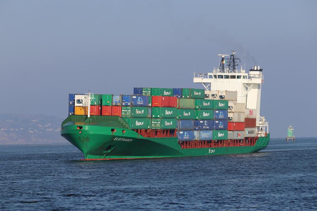 2019年3月29日,在愛爾蘭首都都柏林,一艘集裝箱貨船在駛入都柏林港。新華社發