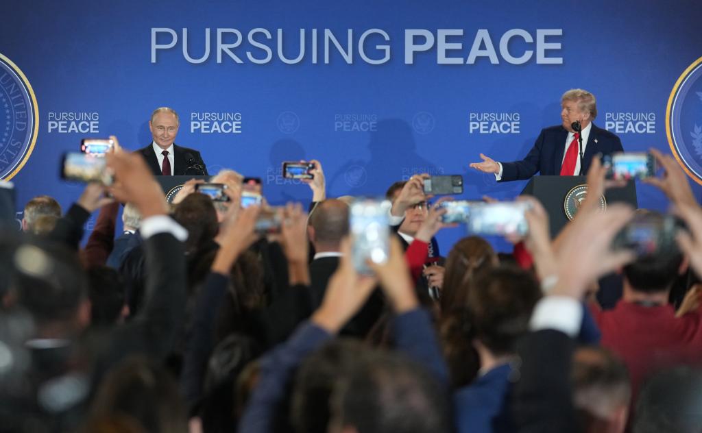 8月15日,美國總統特朗普(右)與俄羅斯總統普京在美國阿拉斯加州安克雷奇市埃爾門多夫-理查森聯合軍事基地舉行會晤后共同出席聯合記者會。新華社記者 吳曉凌 攝