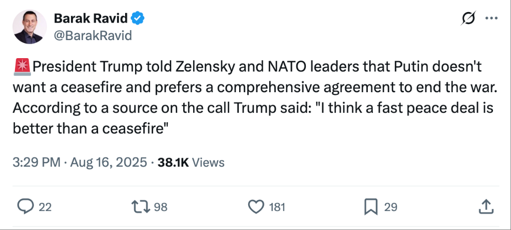 拉維德在一系列推文中還援引消息人士的話透露,特朗普告訴澤連斯基和北約領導人,“普京不想要?;?,而傾向于一項全面協議,從而結束戰爭”。這名消息人士引述特朗普通話時的原話說:“快速(達成)的和平協議比?;鸷??!?/p>