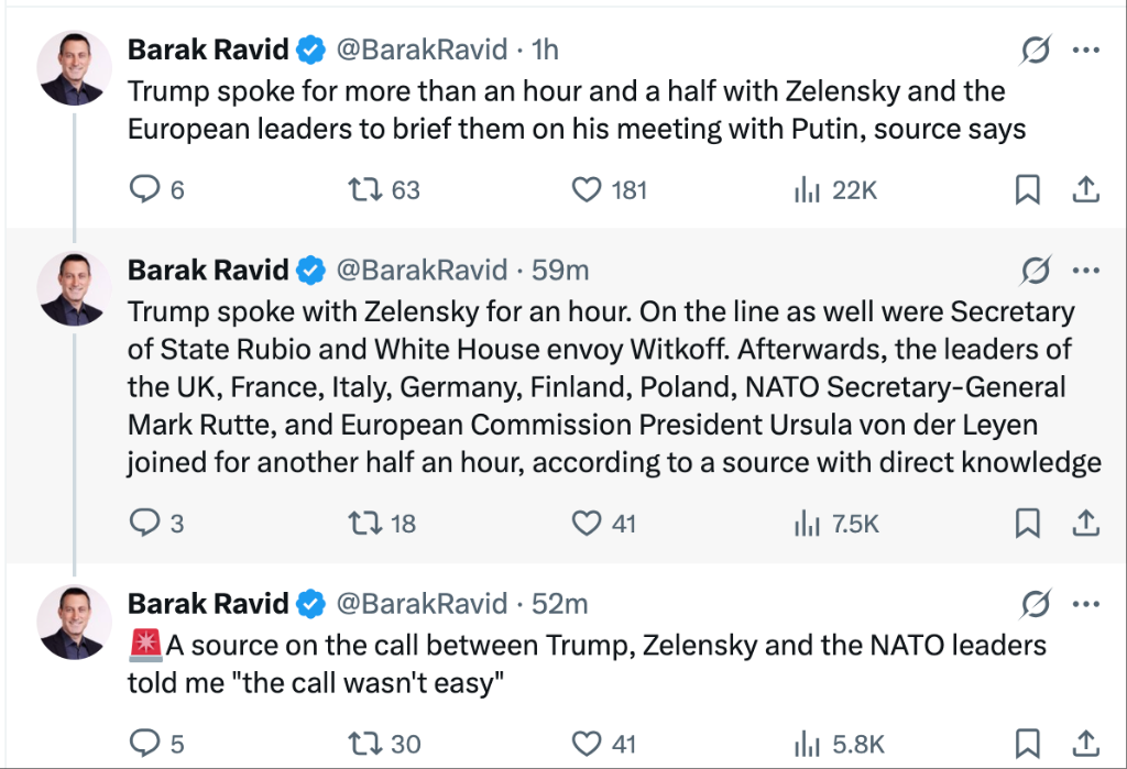 美國阿克西奧斯新聞網站記者巴拉克·拉維德在社交媒體平臺X上披露,特朗普同澤連斯基通話約1小時,隨后多位歐洲領導人加入,繼續通話約半小時,氣氛“不輕松”。