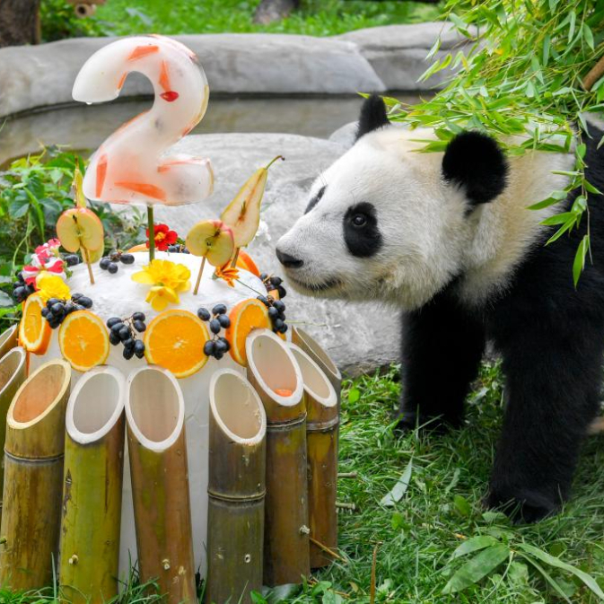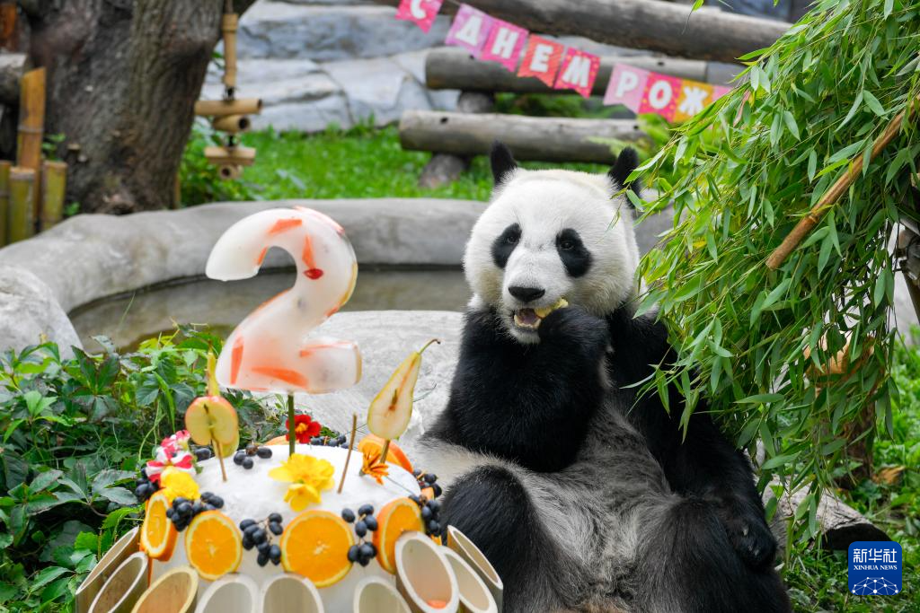 8月24日,大熊貓“喀秋莎”在俄羅斯莫斯科動物園享用“生日蛋糕”。