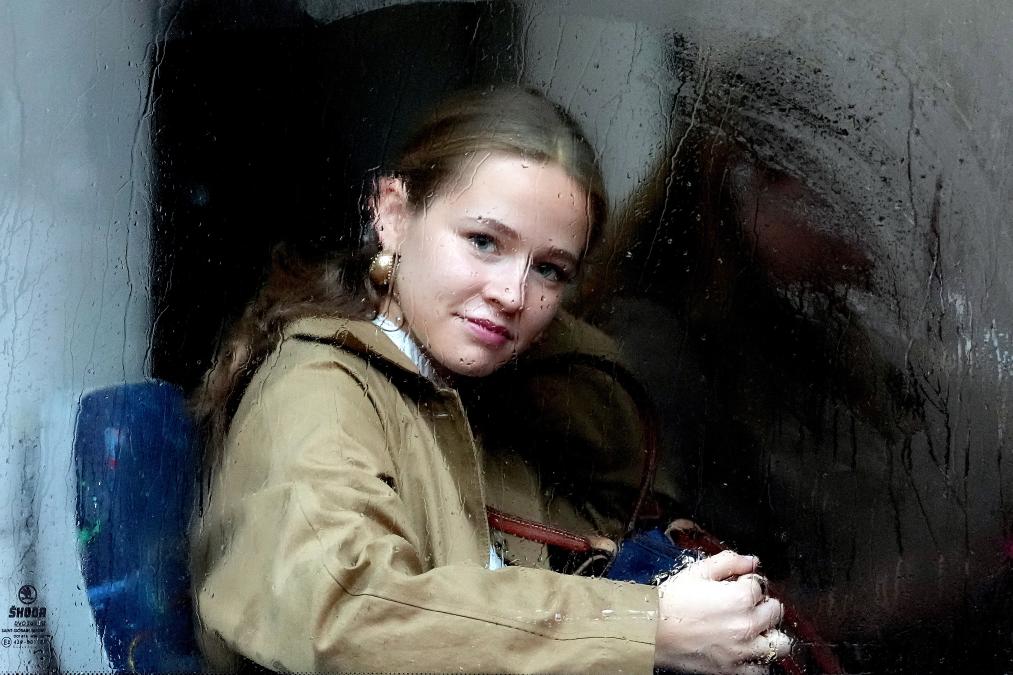 8月26日,在拉脫維亞里加,一名女子透過窗戶看雨。