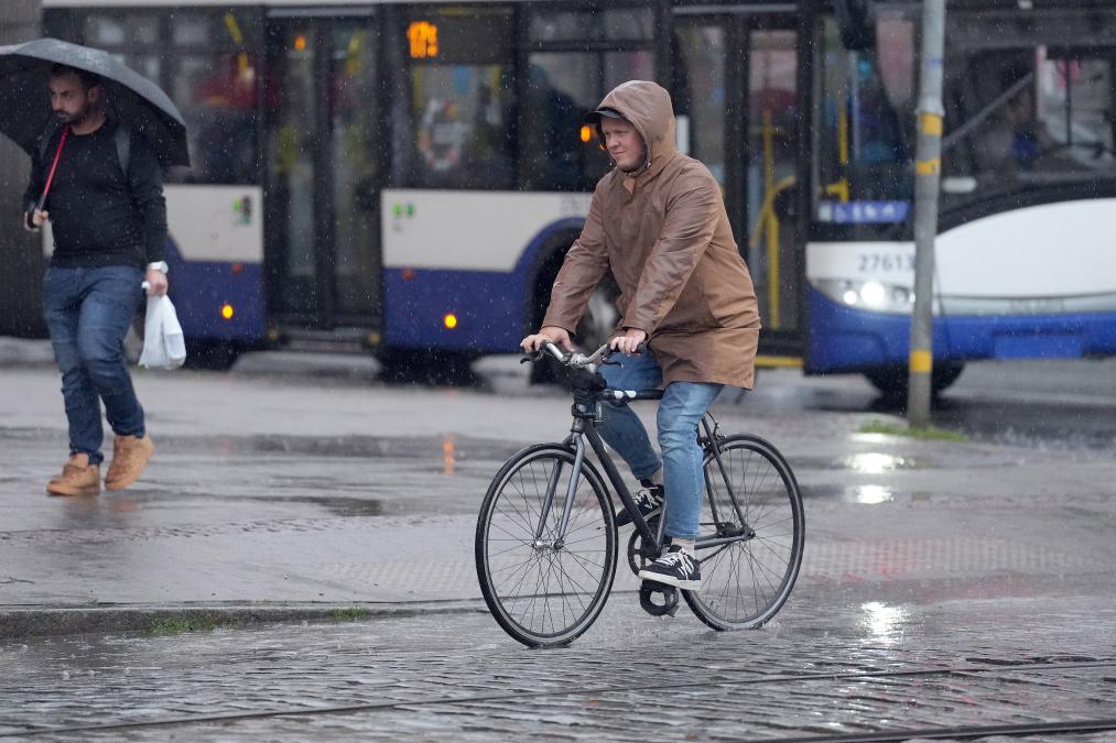 8月26日,在拉脫維亞里加,一名男子冒雨騎車。