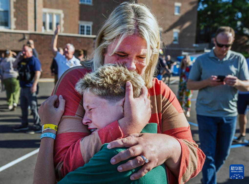 8月27日,在美國明尼蘇達州明尼阿波利斯市南部一所學校,一名母親安慰自己的孩子。美國明尼蘇達州明尼阿波利斯市南部一所學校27日上午發生槍擊事件。新華社/美聯