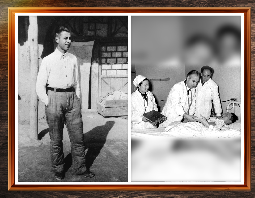 左圖為馬海德在延安窯洞前留影;右圖為1980年,70歲高齡的馬海德教授為小患者看病。