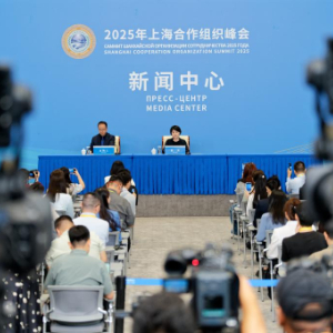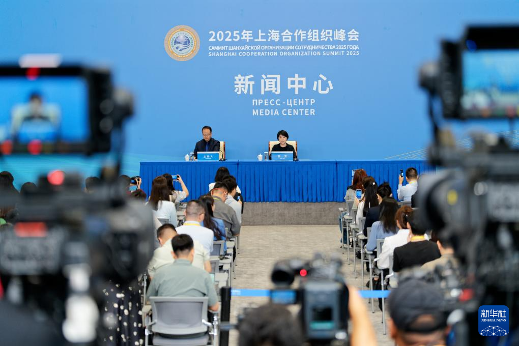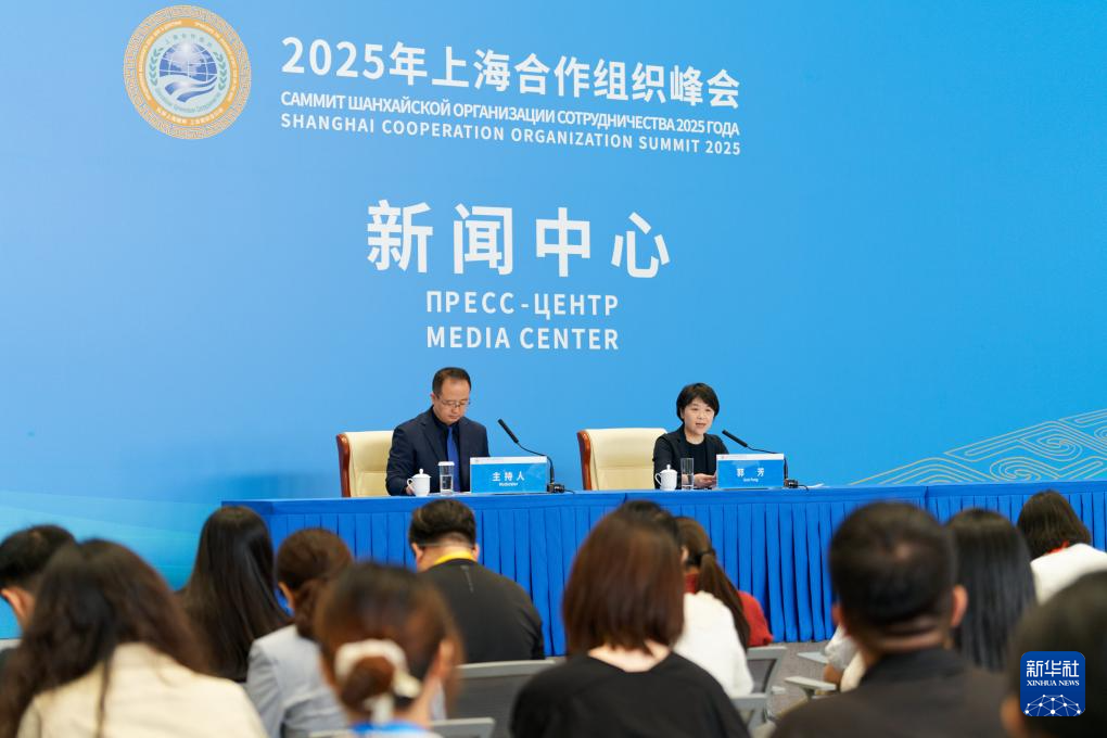 8月30日,在天津梅江國際會展中心,2025年上海合作組織峰會新聞中心舉行生態環境部專場吹風會,生態環境部副部長郭芳介紹上合組織生態環境合作情況,并回答記者提問。這是記者在吹風會現場拍攝。