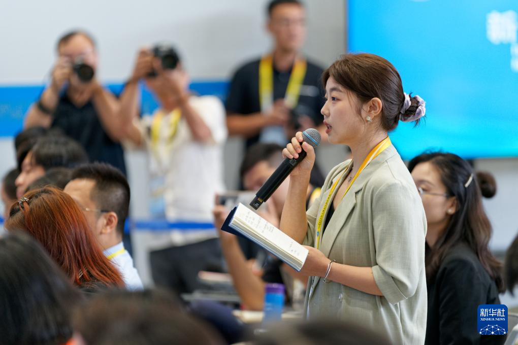 8月30日,在天津梅江國際會展中心,2025年上海合作組織峰會新聞中心舉行生態環境部專場吹風會,生態環境部副部長郭芳介紹上合組織生態環境合作情況,并回答記者提問。這是記者在吹風會現場提問。