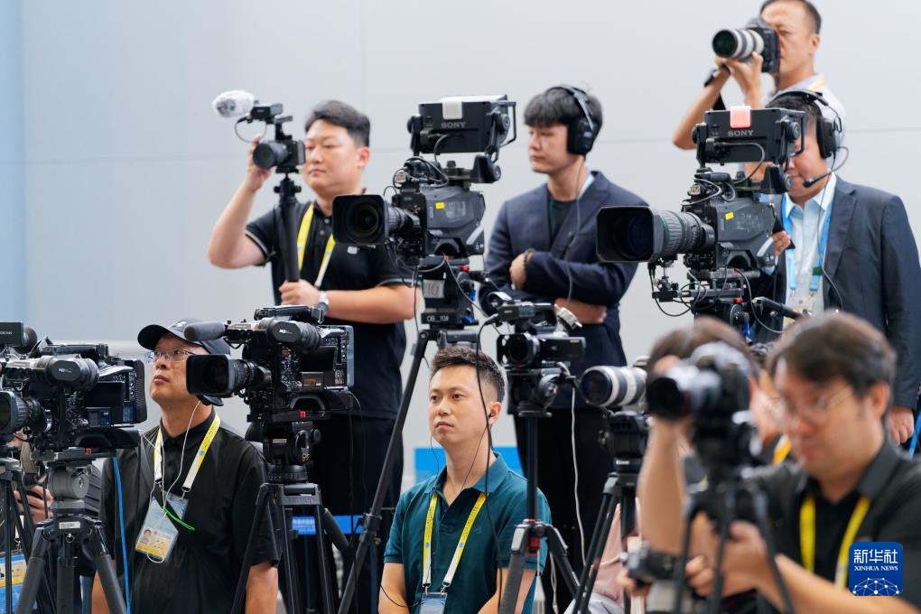 8月30日,在天津梅江國際會展中心,2025年上海合作組織峰會新聞中心舉行生態環境部專場吹風會,生態環境部副部長郭芳介紹上合組織生態環境合作情況,并回答記者提問。這是記者在吹風會現場工作。