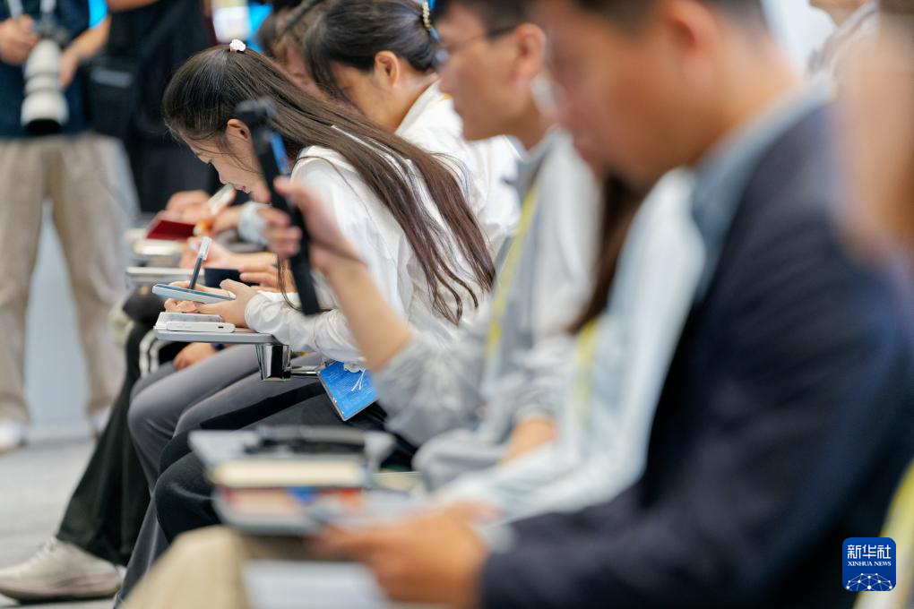 8月30日,在天津梅江國際會展中心,2025年上海合作組織峰會新聞中心舉行生態環境部專場吹風會,生態環境部副部長郭芳介紹上合組織生態環境合作情況,并回答記者提問。這是記者在吹風會現場采訪。