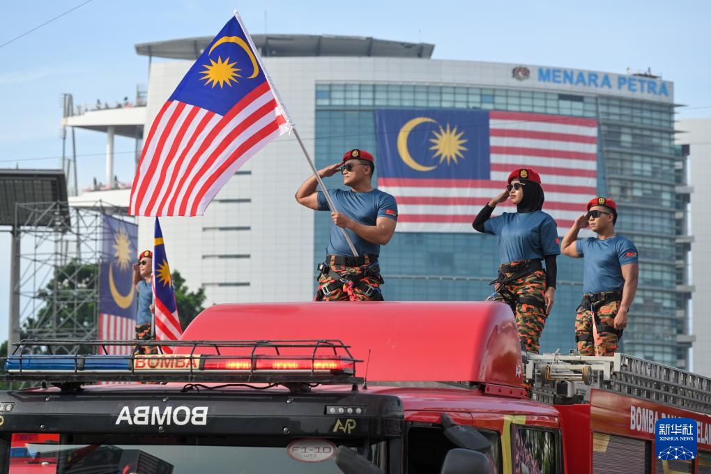 8月31日,消防員在馬來西亞布特拉加亞參加馬來西亞獨立68周年慶典活動。
