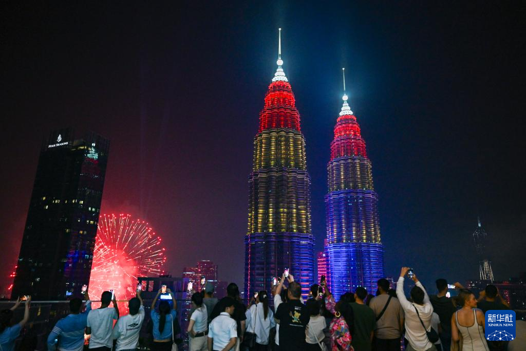 8月31日,在馬來西亞吉隆坡,人們在馬來西亞國家石油公司雙塔附近觀看焰火表演。