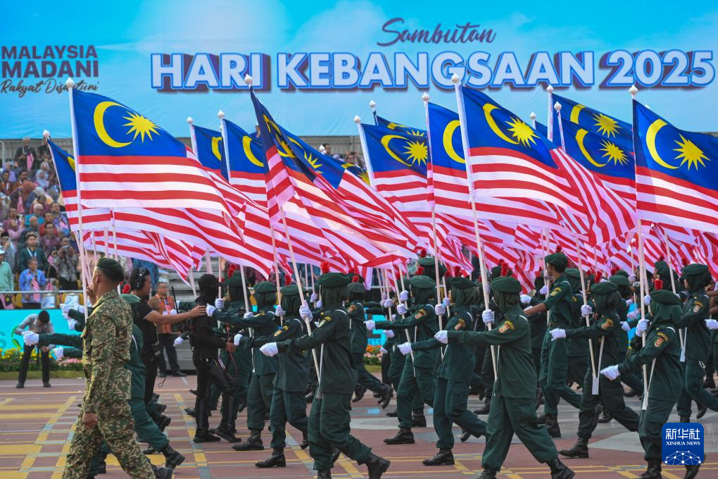 8月31日,馬來西亞最高元首易卜拉欣(前排左五)和馬來西亞總理安瓦爾(前排左四)在布特拉加亞出席馬來西亞獨立68周年慶典活動。