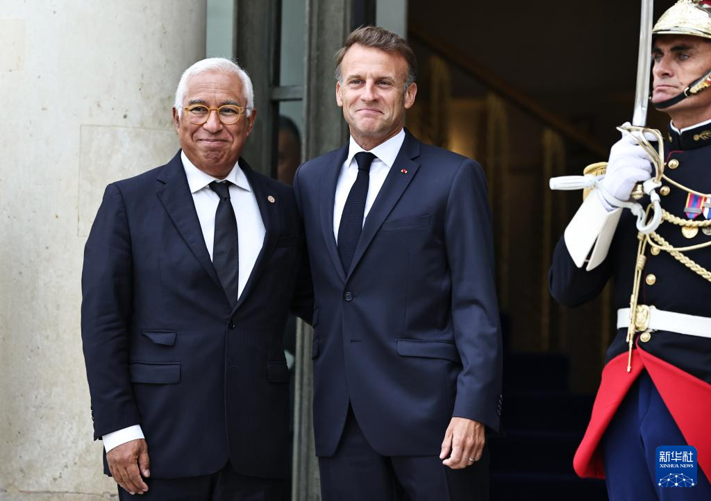9月4日,在法國首都巴黎的總統府愛麗舍宮,法國總統馬克龍迎接出席“志愿聯盟”線上會議的歐洲理事會主席科斯塔(左)。新華社記者 高靜 攝