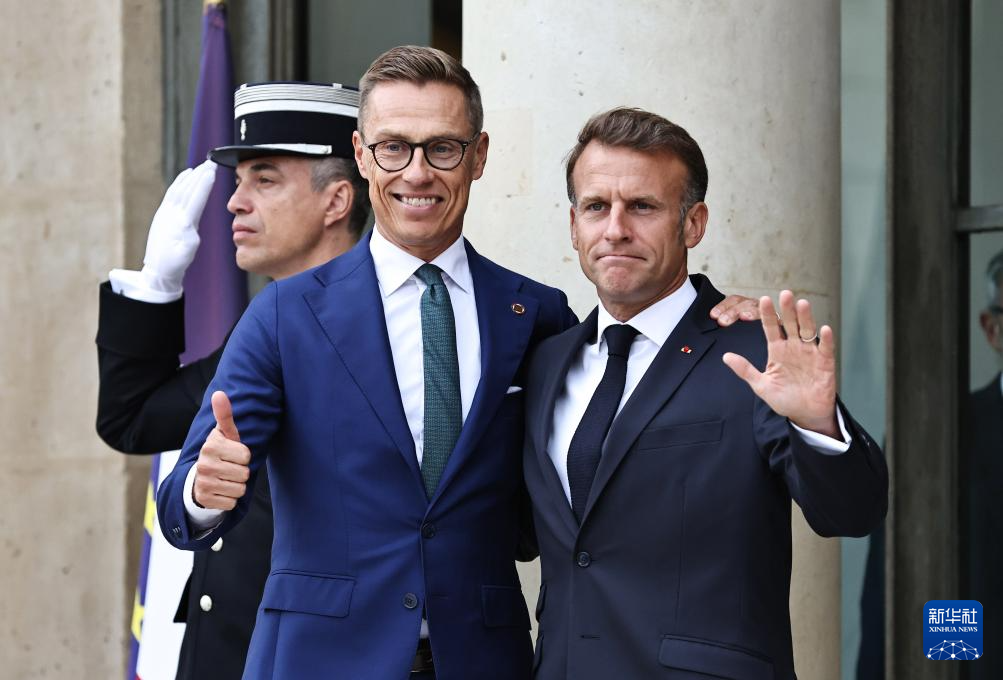9月4日,在法國首都巴黎的總統府愛麗舍宮,法國總統馬克龍(右)迎接出席“志愿聯盟”線上會議的芬蘭總統斯圖布。新華社記者 高靜 攝