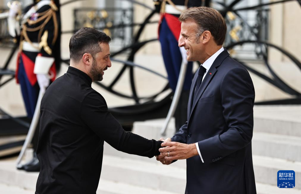 9月4日,在法國首都巴黎的總統府愛麗舍宮,法國總統馬克龍(右)迎接出席“志愿聯盟”線上會議的烏克蘭總統澤連斯基。新華社記者 高靜 攝