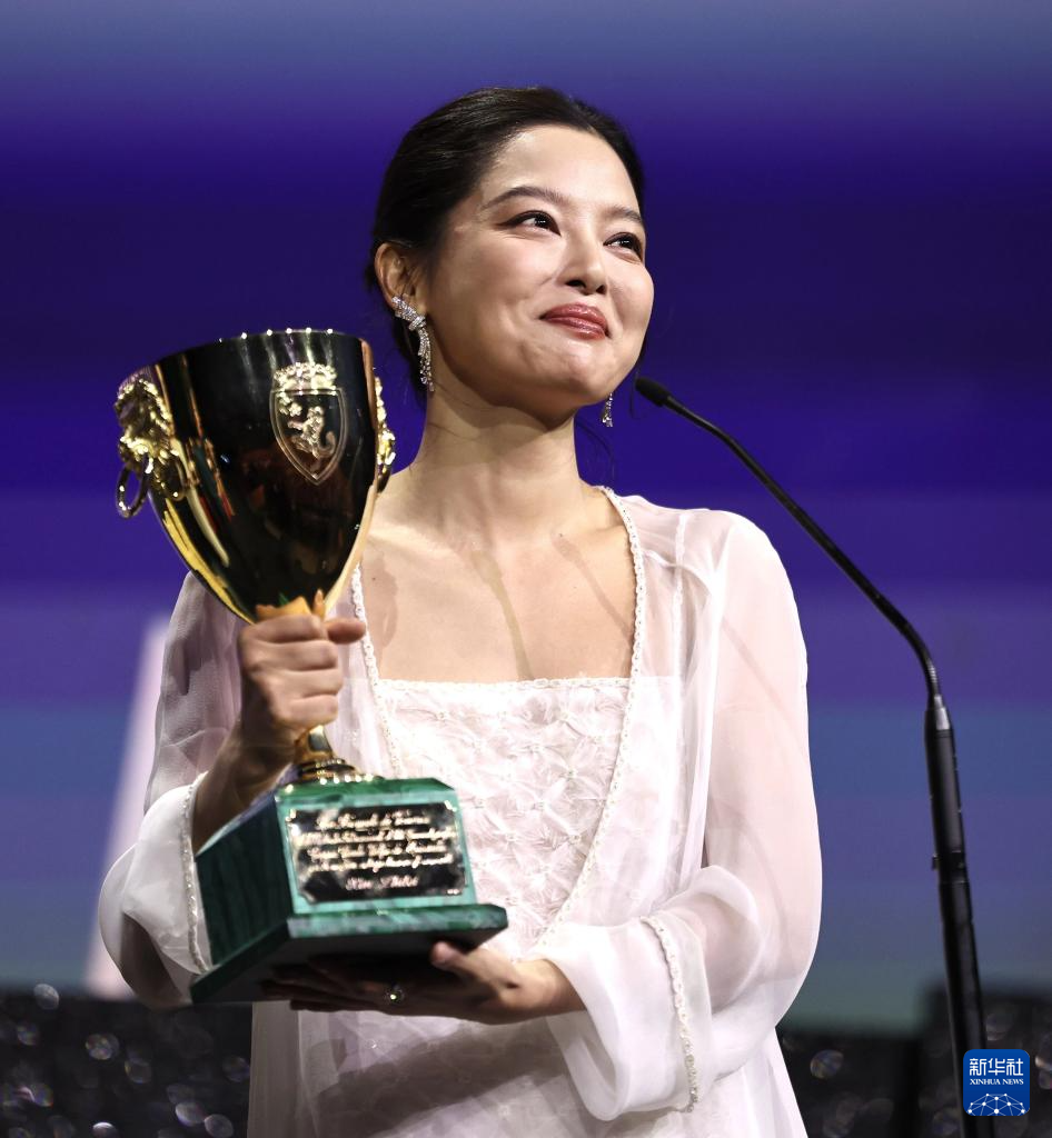 9月6日,在意大利威尼斯,辛芷蕾奪得第82屆威尼斯電影節最佳女演員獎。新華社記者 李京 攝