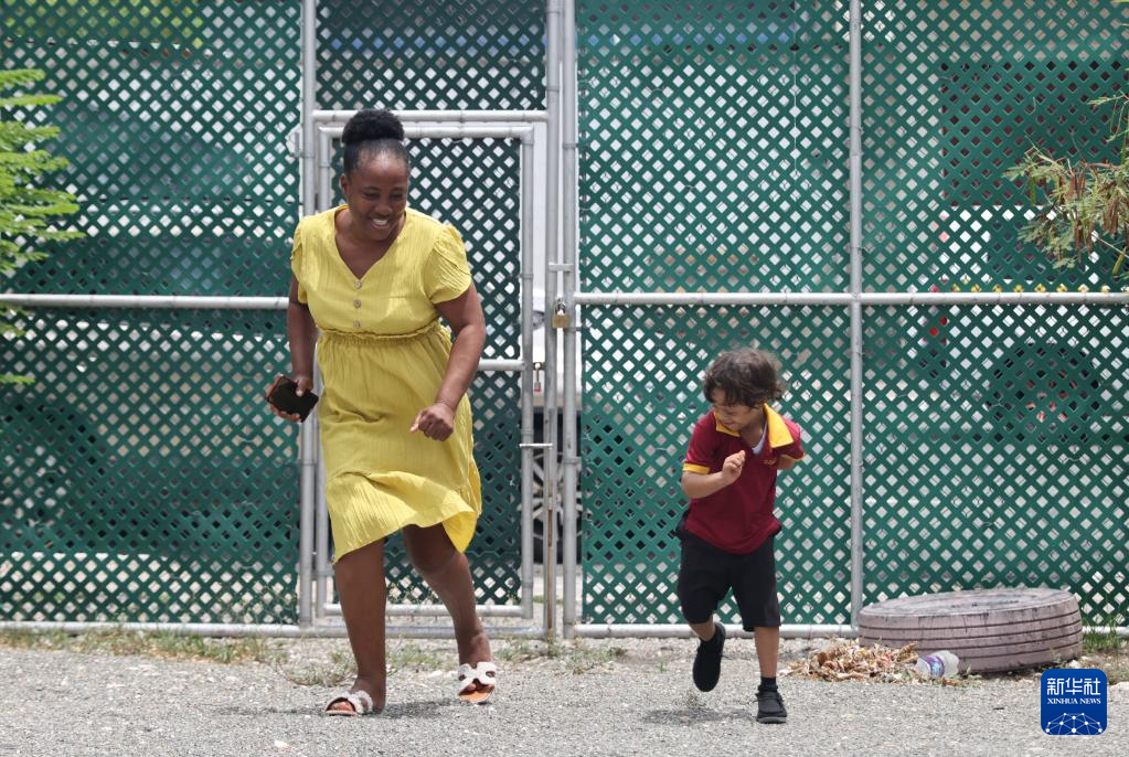 9月4日,在牙買加首都金斯敦艾特特殊教育小學,老師陪伴學生在操場玩耍。新華社記者 李夢馨 攝