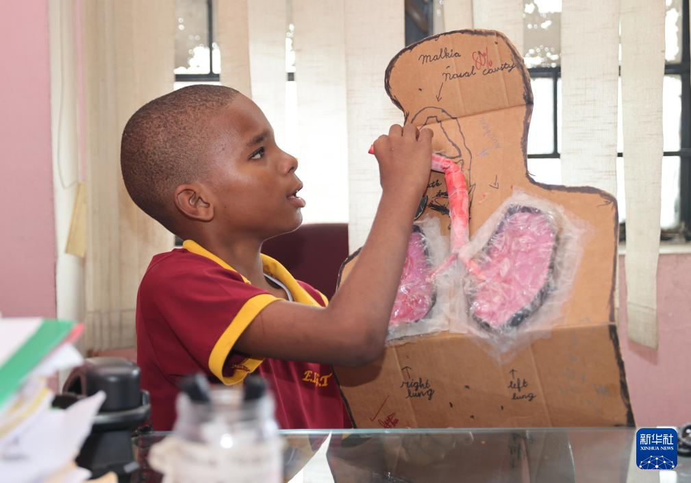9月4日,在牙買加首都金斯敦艾特特殊教育小學,學生展示自己制作的手工作品。新華社記者 李夢馨 攝