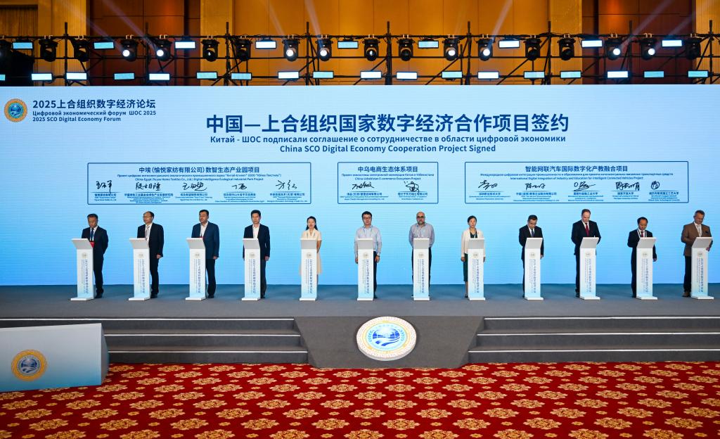 在2025上合組織數字經濟論壇上,中國—上合組織國家數字經濟合作項目進行簽約(2025年7月11日攝)。新華社記者 趙子碩 攝