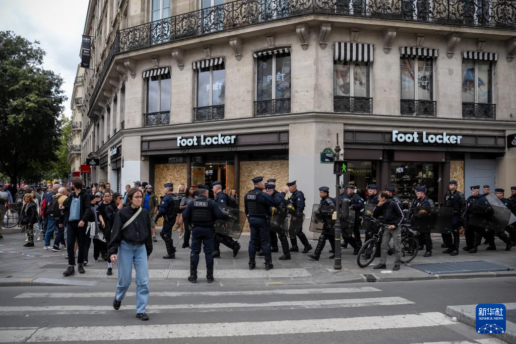 9月10日,警察在法國巴黎夏特萊廣場附近的游行示威現場警戒。新華社發(奧雷利安·莫里薩爾攝)