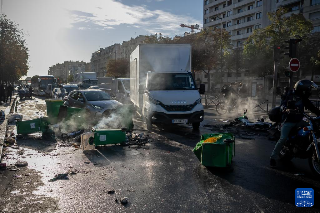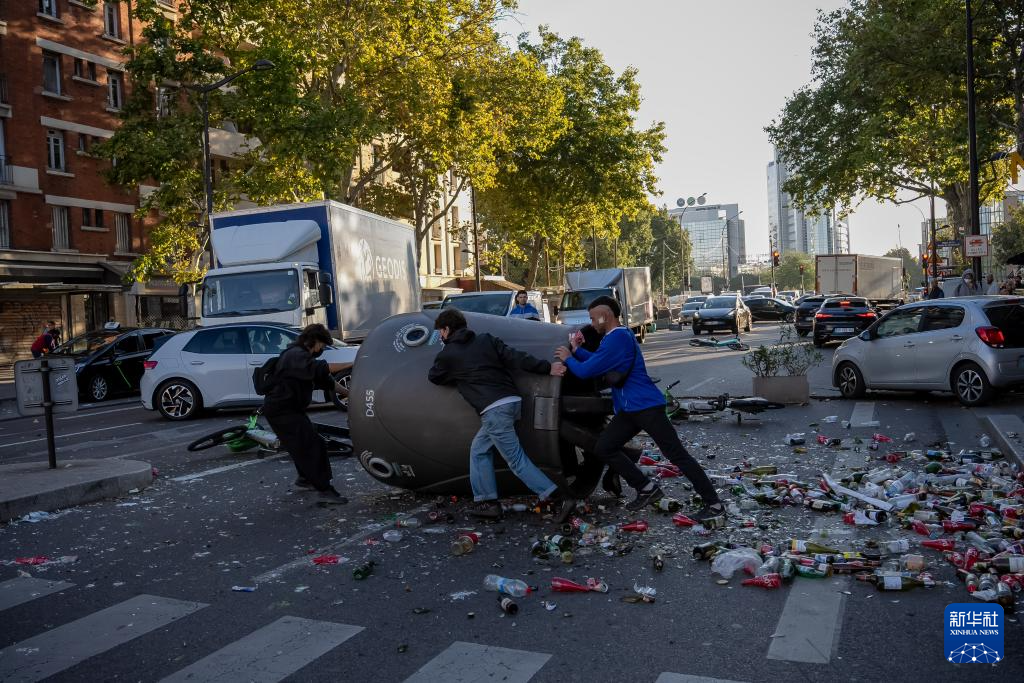 9月10日,在法國巴黎街頭,示威者用垃圾桶封鎖道路。新華社發(奧雷利安·莫里薩爾攝)
