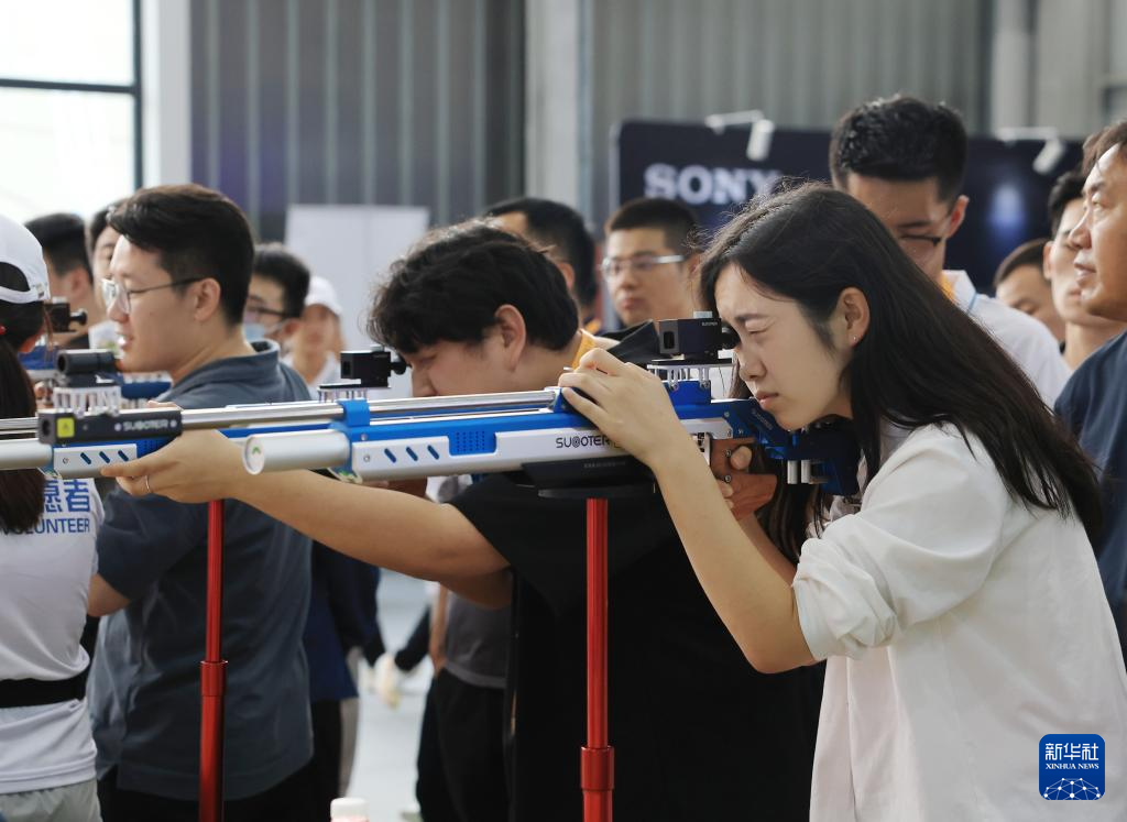 9月11日,參觀者在體育服務專題展區體驗激光射擊。