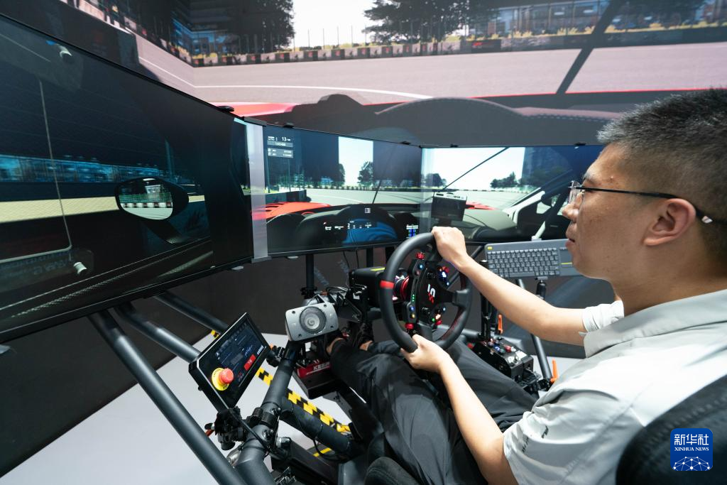 9月11日,參觀者在體驗六自由度賽車模擬器。