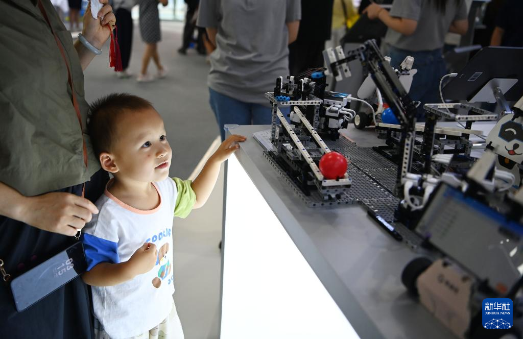 9月11日,在服貿會教育服務專題展區,一名小朋友在猿編程展臺觀看最新AI教育產品。