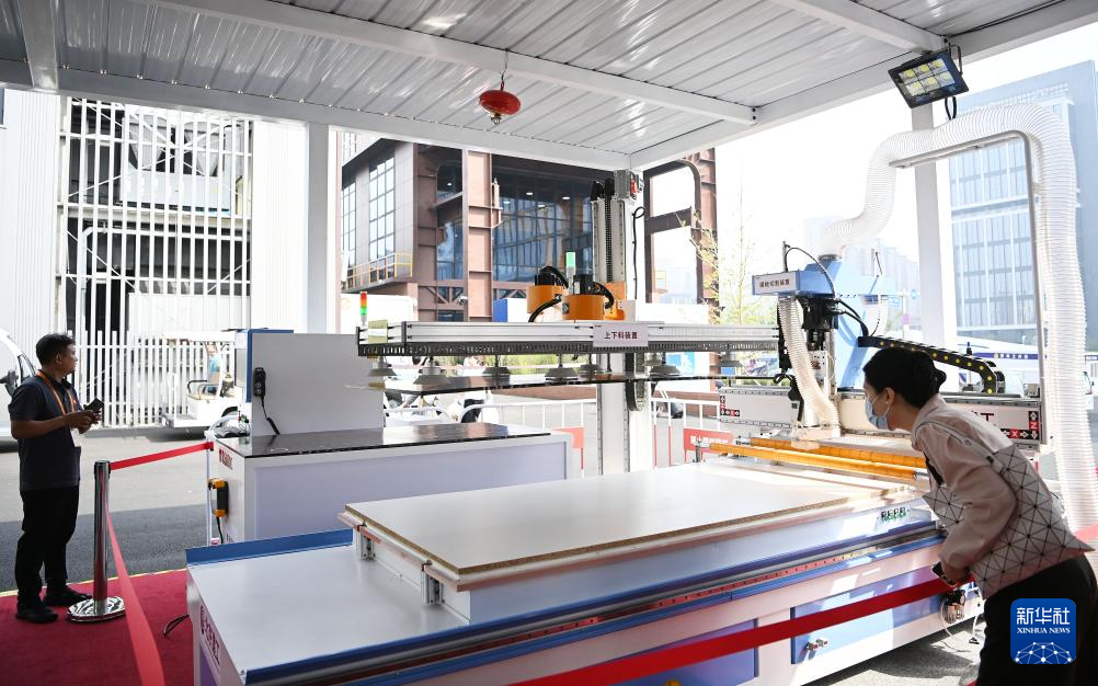 9月11日,在服貿會工程咨詢與建筑服務專題展區,參觀者(右)在北京建工展臺參觀智能模板無人工廠。