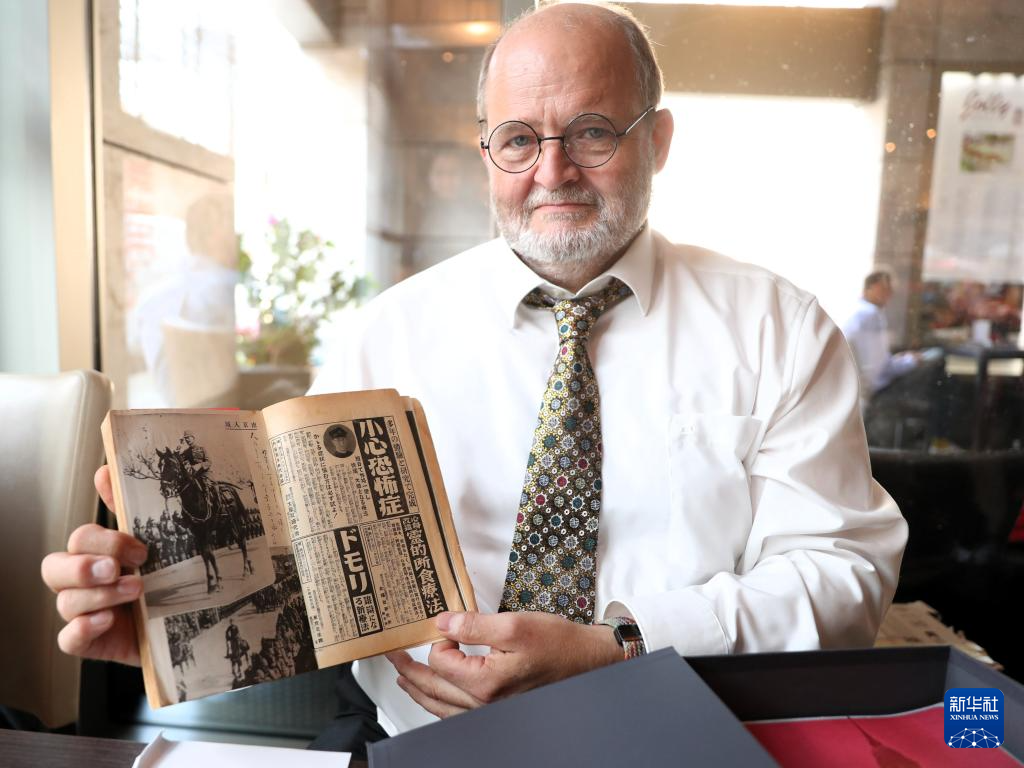8月7日,在德國柏林,國際友人約翰·拉貝的曾外孫克里斯托夫·賴因哈特展示自己收藏的南京大屠殺歷史資料。新華社記者 杜哲宇 攝