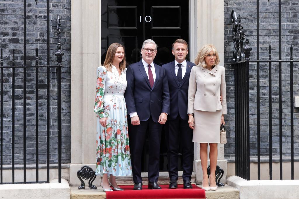 7月9日,英國首相斯塔默(左二)和夫人(左一)在英國倫敦唐寧街10號首相府前迎接法國總統馬克龍(右二)和夫人。新華社發