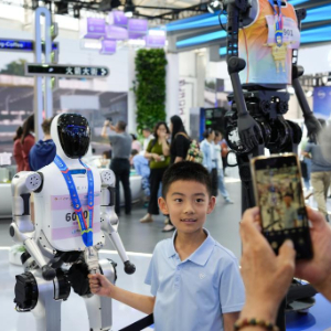 9月13日,在北京首鋼園,小朋友在2025年服貿會文旅服務戶外展區與AI具身智能機器人“AI小螞ROBOT”互動。