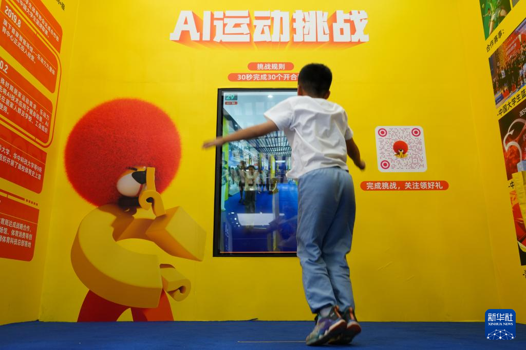 9月13日,在體育服務專題展區橙獅慧影展臺,小朋友體驗“AI運動挑戰”項目。