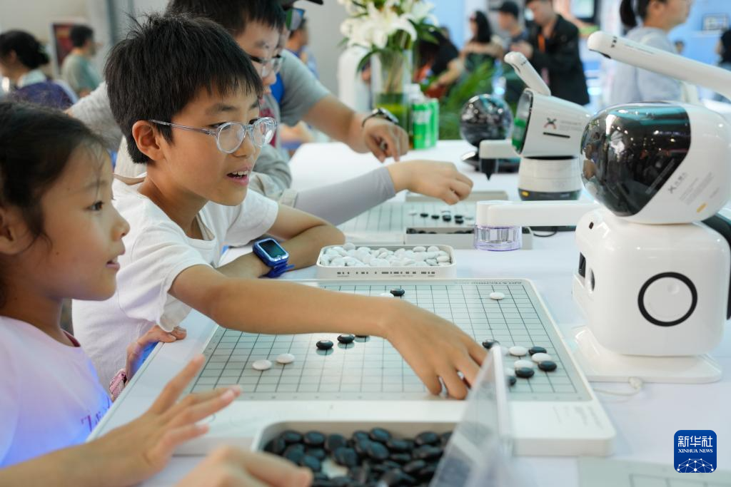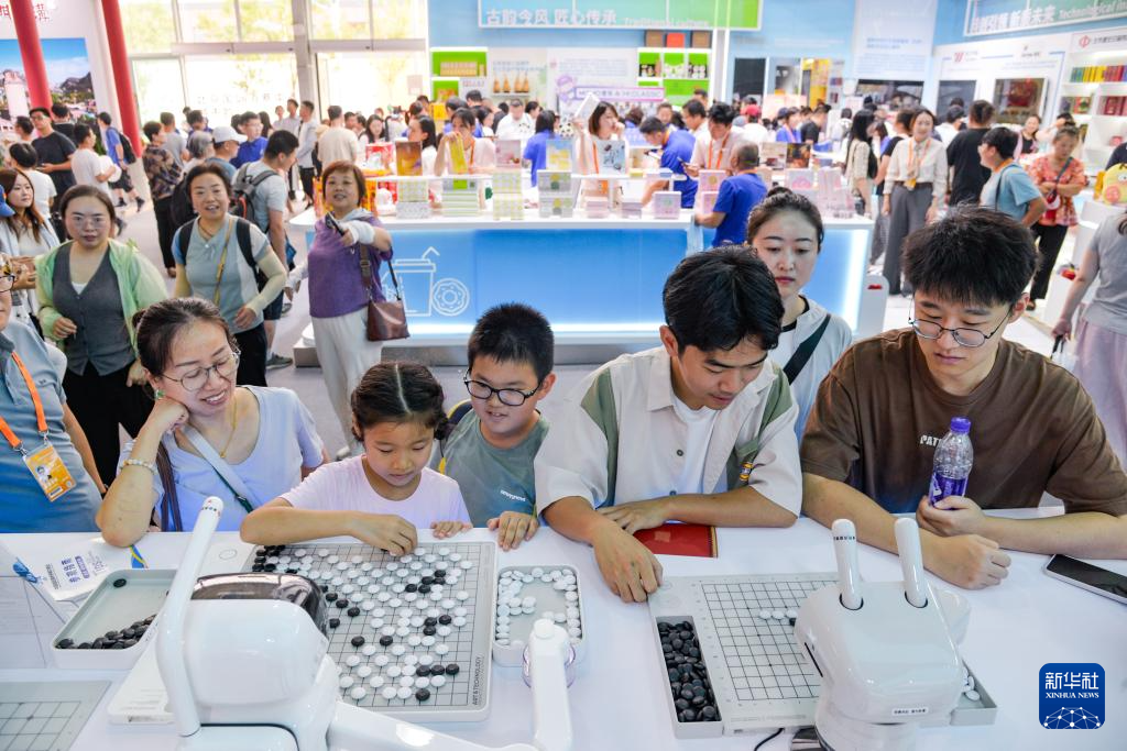 9月13日,在文旅服務專題展區經開區展臺,小朋友和機器人下五子棋。