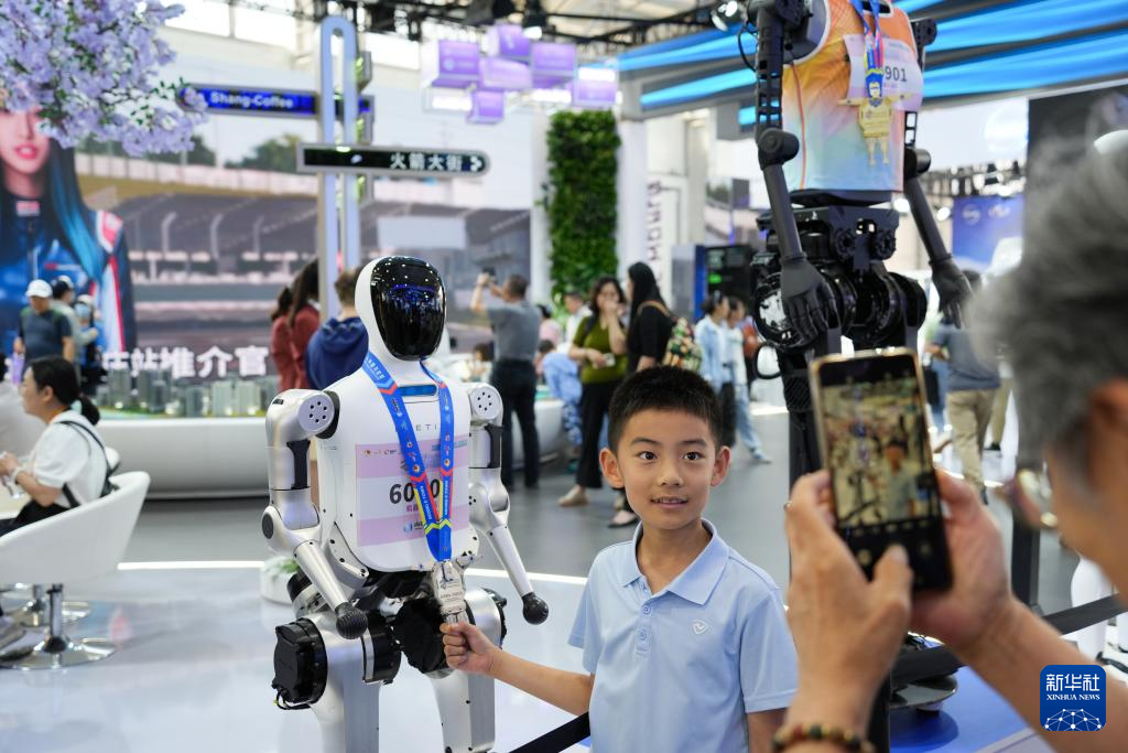 9月13日,在電信、計算機和信息服務專題展區北京方案展展臺,小朋友和機器人馬拉松比賽獲獎機器人合影。