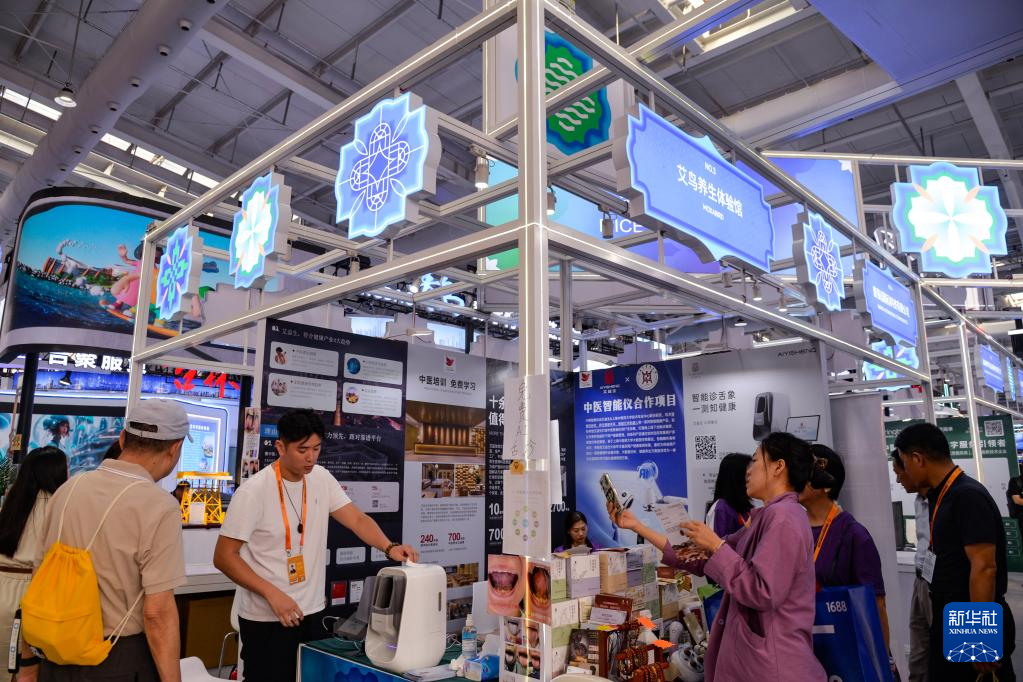 9月12日,在北京首鋼園,人們在2025年服貿會澳門艾鳥養生體驗館展臺參觀、咨詢。新華社記者 徐欽 攝