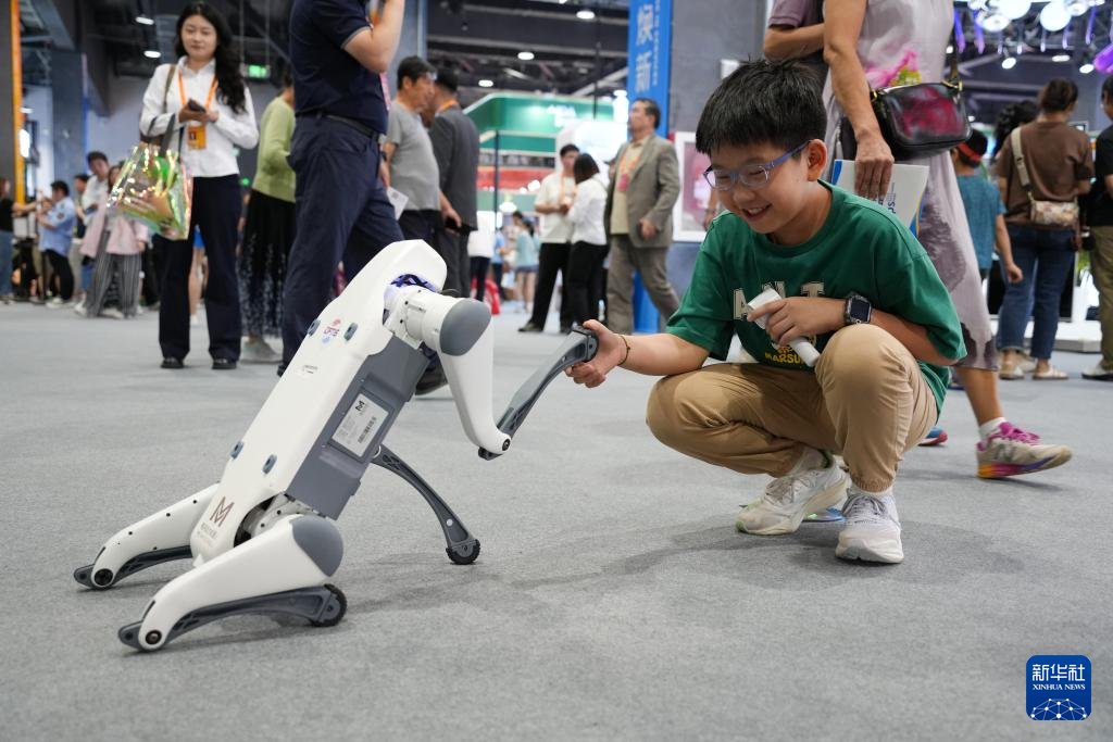 9月13日,小朋友在服貿會展館內與機器狗互動。