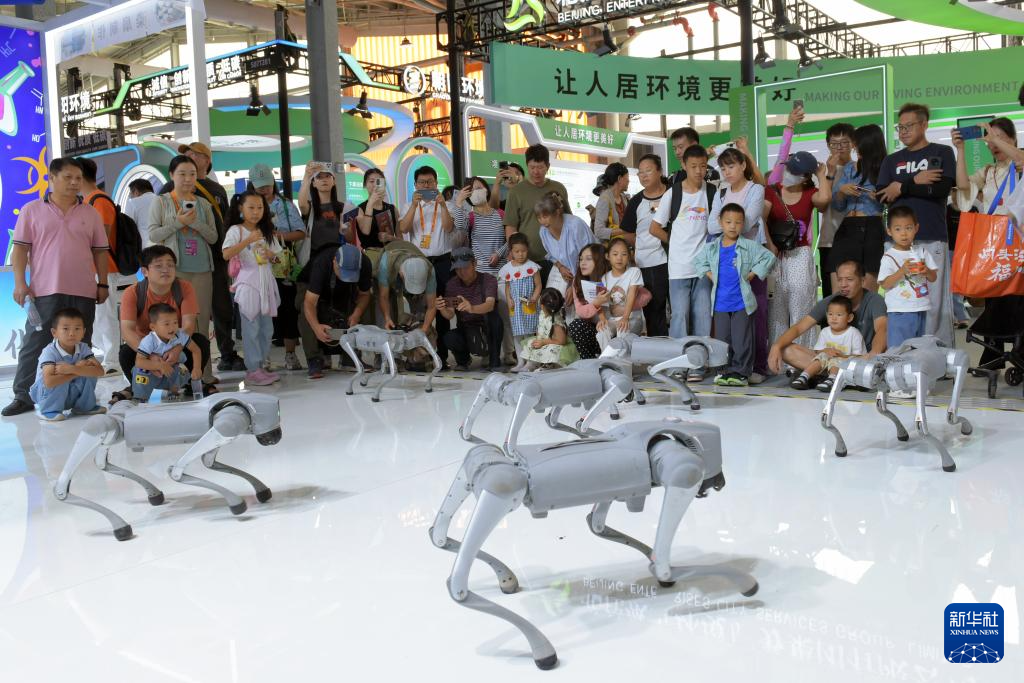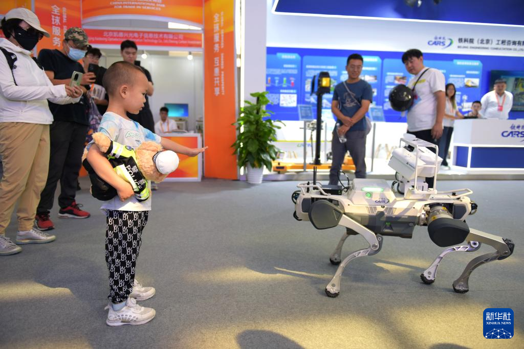 9月13日,人們在服貿會環境服務專題展區觀看機器狗表演。