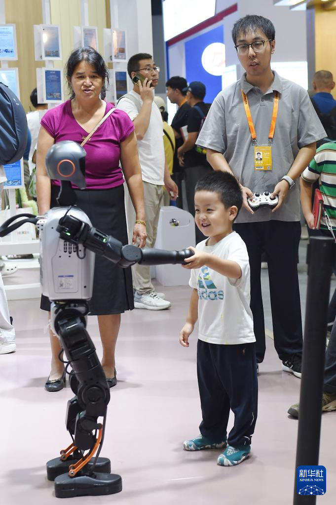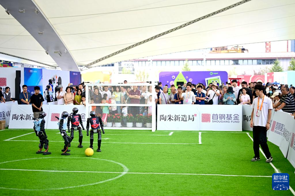9月13日,人們在北京首鋼園2025年服貿會體育服務專題展區觀看人形機器人踢足球。