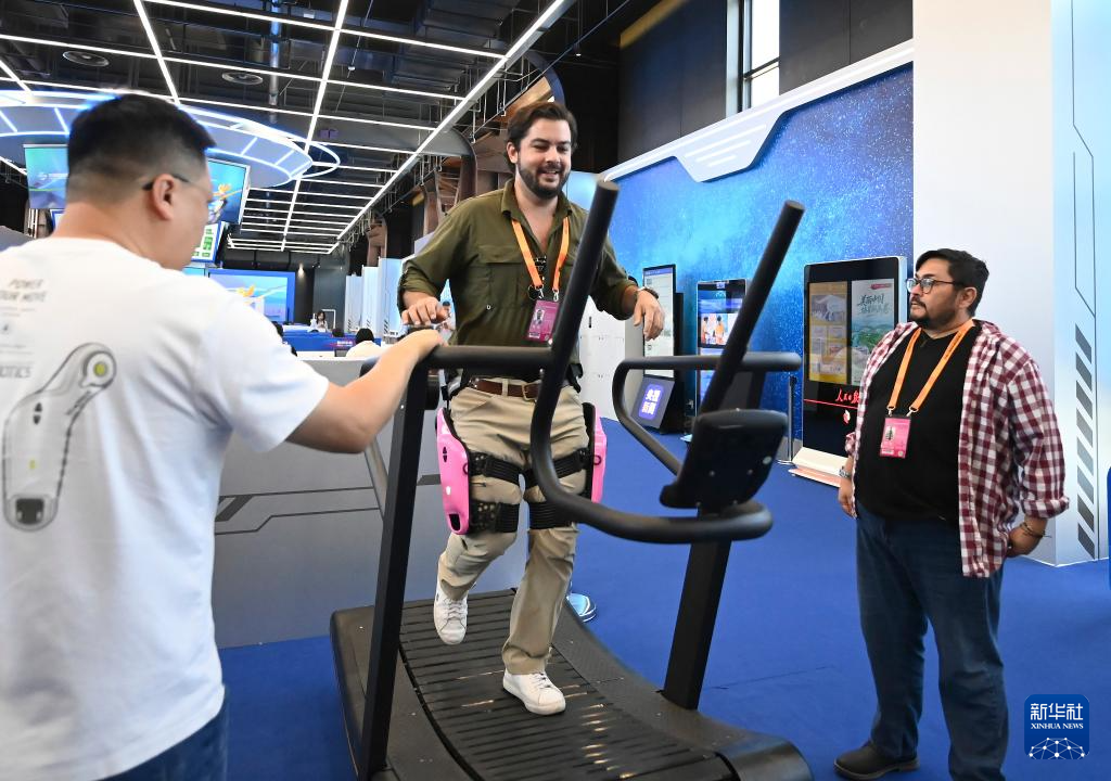 9月14日,一名外國記者(左二)在服貿會新聞中心體驗“增程動力外骨骼機器人”。