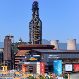 9月14日,人們在北京首鋼園區三高爐前的泡泡瑪特主題雕塑前駐足拍攝。