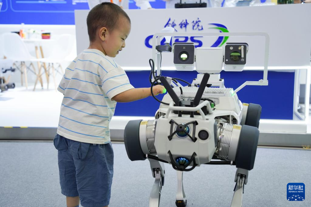 9月14日,小朋友在環境服務專題展區與機器狗互動。