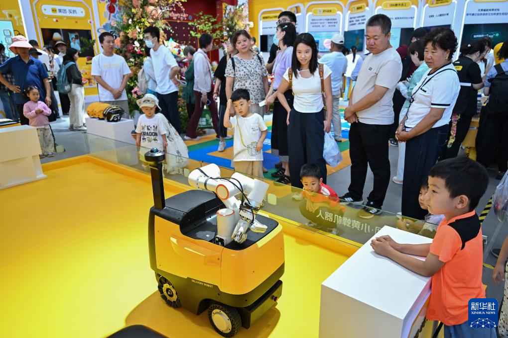 9月14日,觀眾在服貿會美團展臺觀看配送機器人。