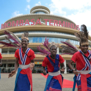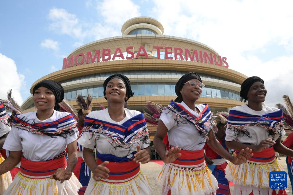 9月17日,在蒙內鐵路蒙巴薩終點站,身穿傳統民族服裝的演員跳舞慶祝蒙巴薩通勤米軌修復項目完工。
